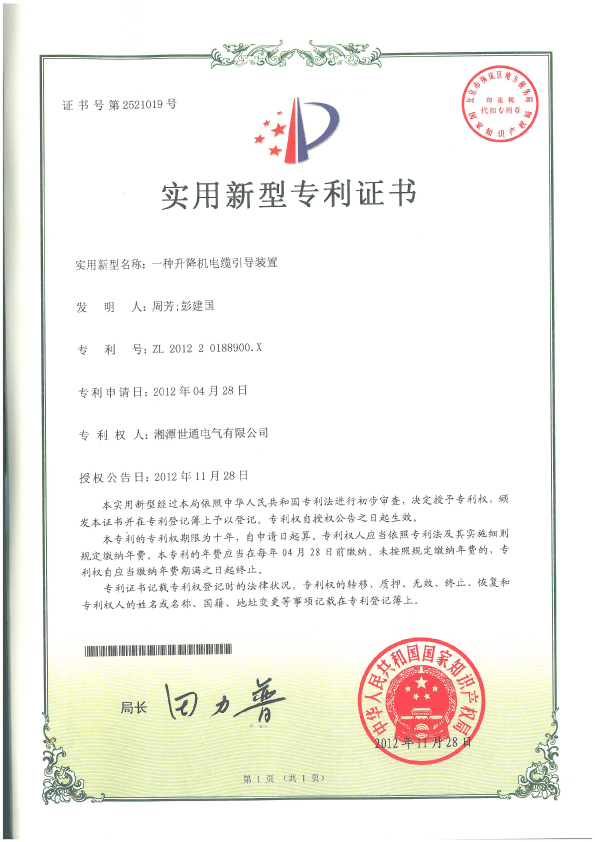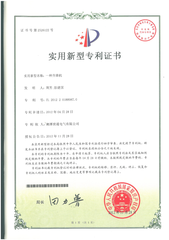 本公司塔筒專用升降機(jī)獲得多項(xiàng)國家專利